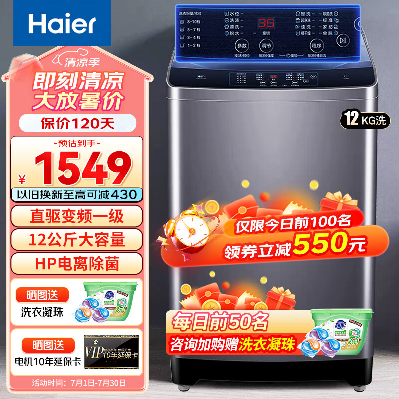 海尔全自动波轮洗衣机家用大容量12公斤洗衣机直驱变频一级能效 智能预约 海立方内桶 HP电离除菌价格:2099.00元!