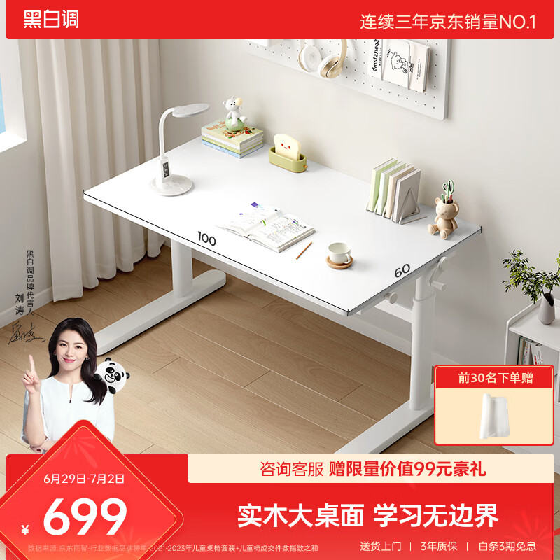 黑白调学习时光A1学习桌【可升降大桌面 进口环保实木】儿童书桌电脑桌 1m白色价格:1699.00元!