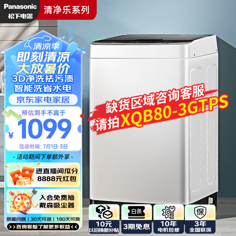 松下(Panasonic)波轮洗衣机全自动 8公斤宿舍租房神器 智能洗 节能省水省电 桶自洁不脏桶 XQB80-KYA0N价格:1110.00元!