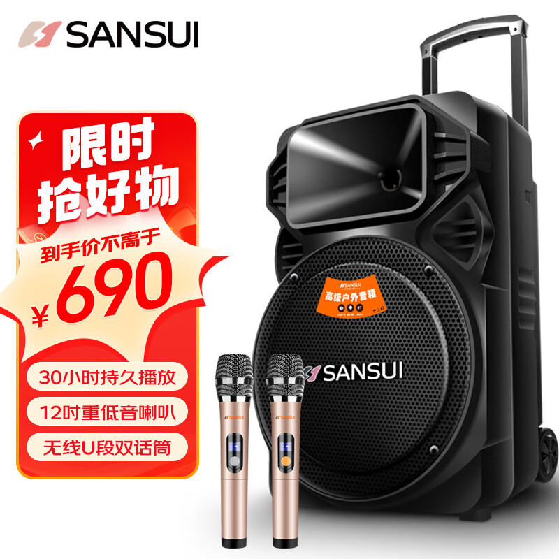 山水(SANSUI)广场舞音响音箱专业设备 户外k歌专用拉杆音响 移动便携式蓝牙播放器 大功率 双话筒 SS6-12价格:690.00元!