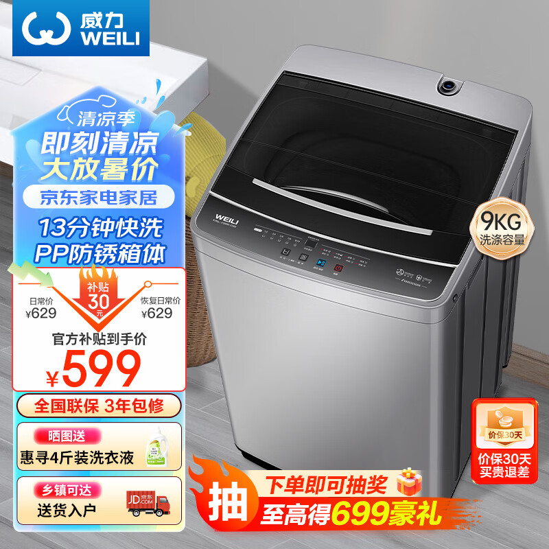 威力(WEILI)9公斤大容量全自动波轮洗衣机 护衣内筒 13分钟快洗 防锈箱体 十档水位 以旧换新 XQB90-2399价格:599.00元!