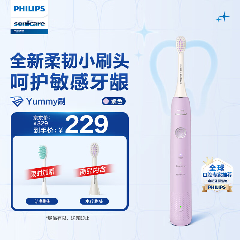 飞利浦(PHILIPS)电动牙刷S1 成人情侣款送男/女友礼物 3种模式 全新柔韧SPA刷头HX2411/01 Yummy刷 紫色价格:229.00元!