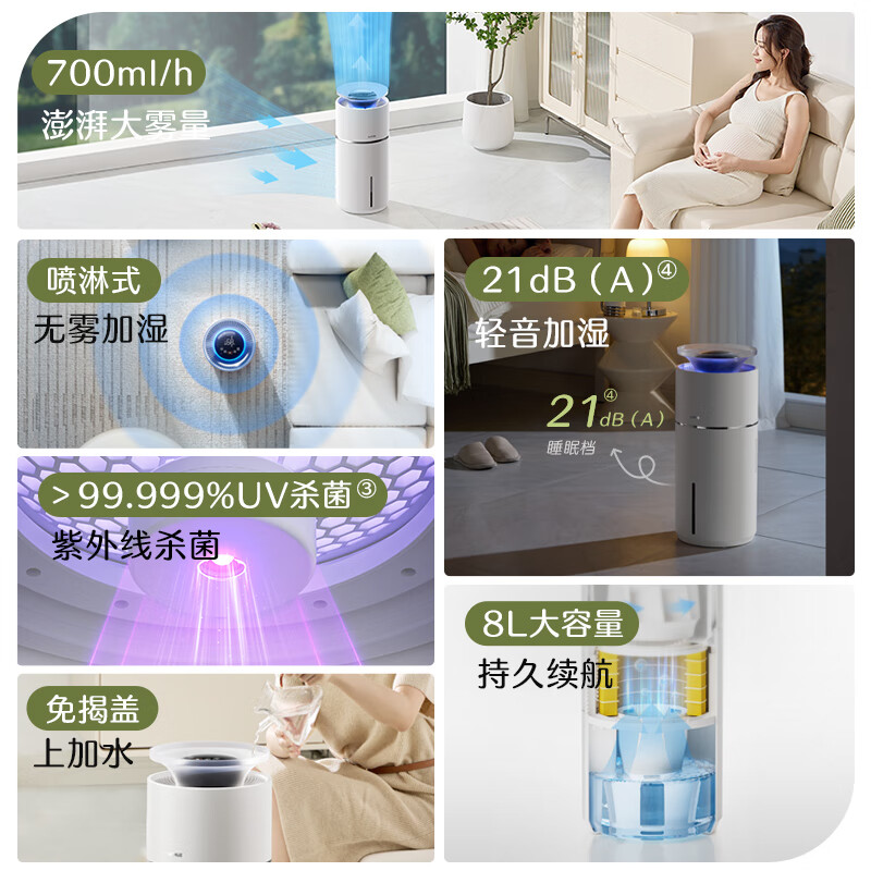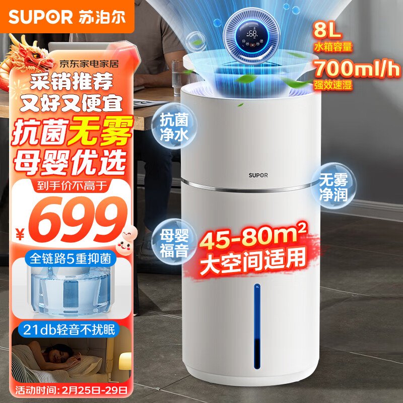 苏泊尔(SUPOR)无雾加湿器卧室家用办公室婴儿孕妇700ml/h快速加湿空气8L超大容量银离子纯净式加湿器EHLN-11A价格:699.00元!
