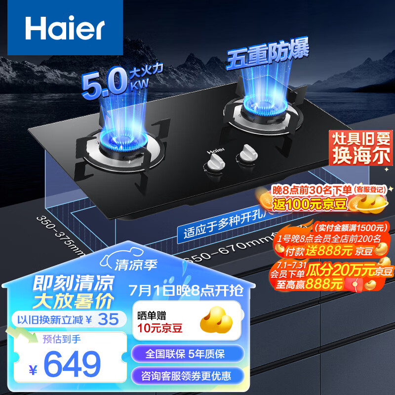 海尔(Haier)燃气灶 5.0kW大火力嵌入式瞬燃点火家用全进风钢化玻璃双眼煤气灶双灶 燃气灶天然气 Q2BE2价格:649.00元!