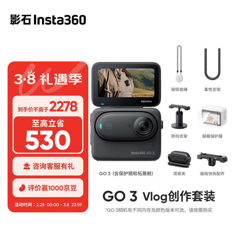 Insta360影石 GO 3拇指相机 运动亲子Vlog骑行宠物防水防抖运动相机(Vlog创作套装 星曜黑64G版)价格:2278.00元!