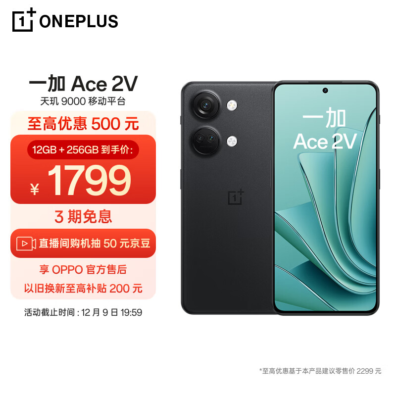 OPPO 一加 Ace 2V 12GB+256GB 黑岩 天玑 9000 移动平台 1.5K 灵犀触控直屏 6400 万超清三摄 5G游戏性能手机价格:2299.00元!