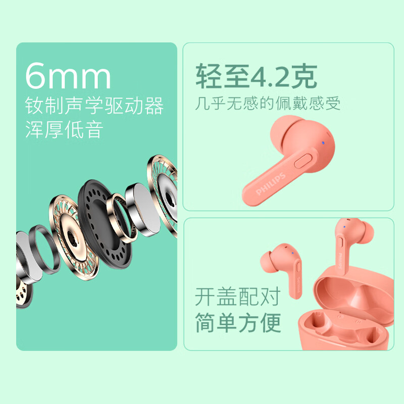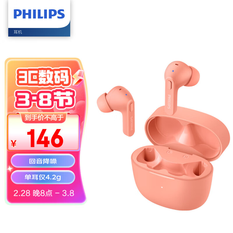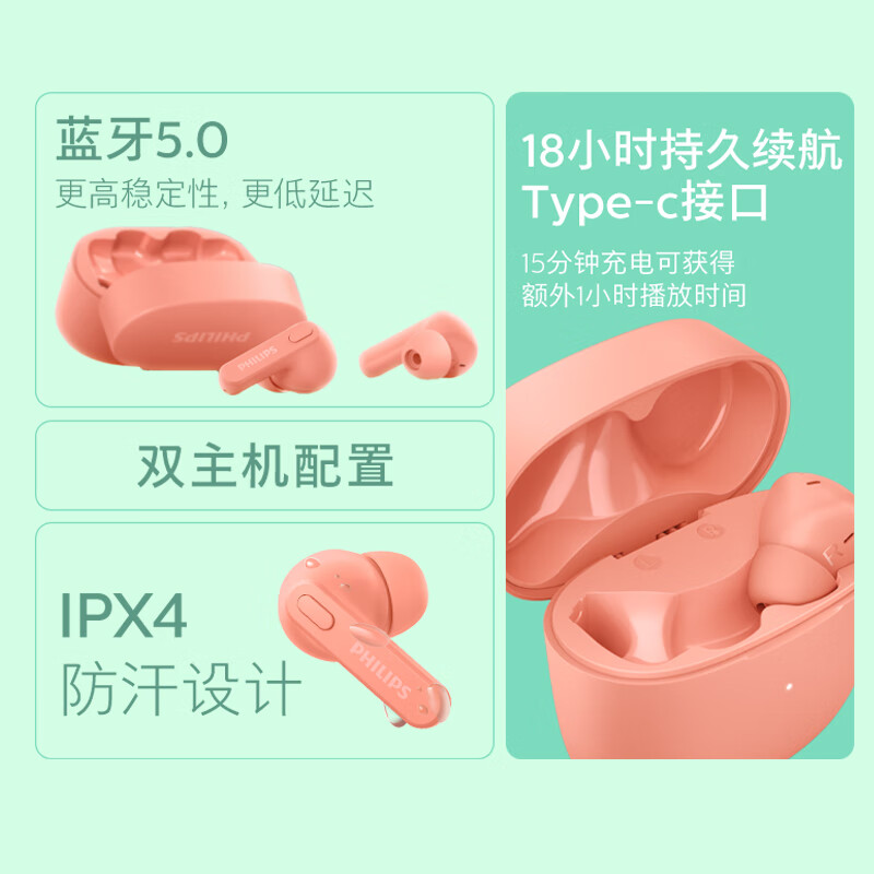 飞利浦(PHILIPS)真无线蓝牙耳机无线运动耳机游戏耳机回音降噪CD级高清音质苹果华为手机TAT2206粉价格:146.00元!