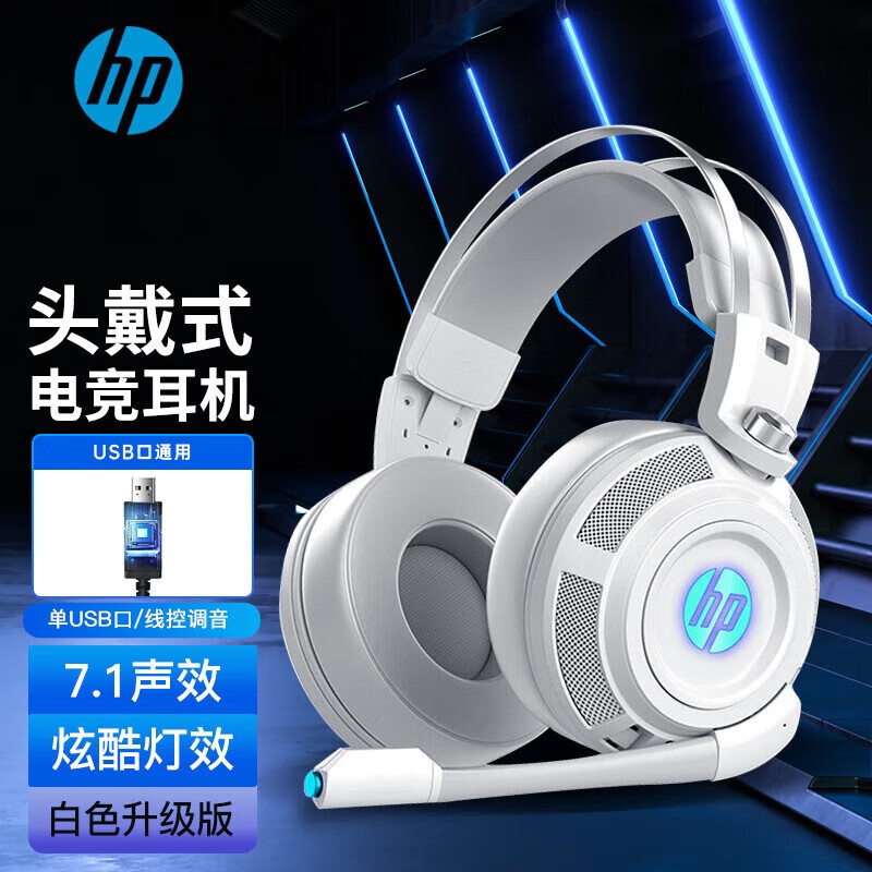 惠普(HP)H200 头戴式耳机有线电竞游戏耳机立体声降噪发光学习办公带线立体声 【7.1声效】白色价格:119.00元!