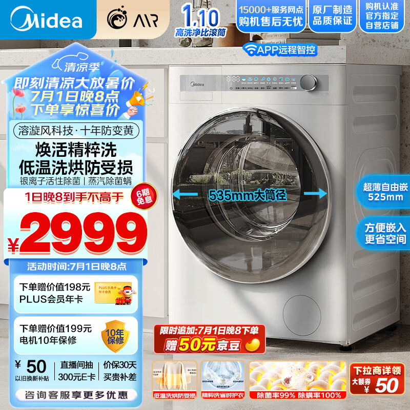 美的(Midea)滚筒洗衣机全自动 AIR系列 MD100AIR1 洗烘一体机 焕活精粹洗 超薄自由嵌 低温烘 云朵系列10公斤价格:2999.00元!