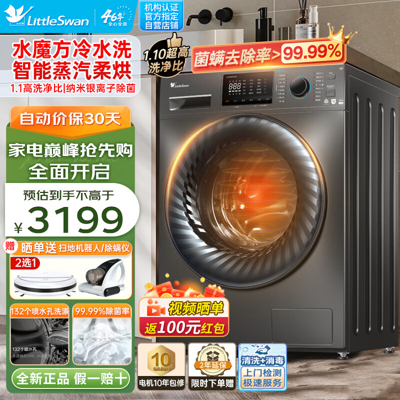 小天鹅(LittleSwan)全自动滚筒洗衣机洗烘一体机 10公斤家用一级能效变频868水魔方护型护色银离子除菌TD100V868WMADT价格:3099.00元!