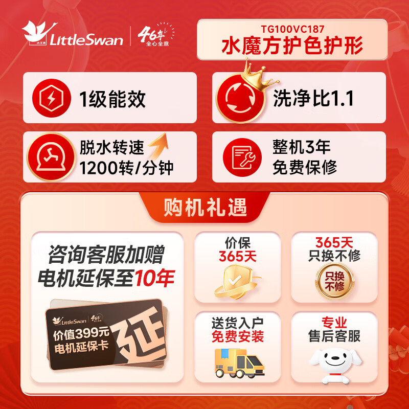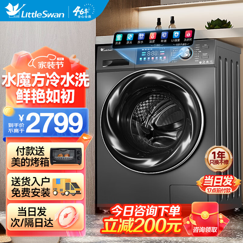 小天鹅(LittleSwan)滚筒洗衣机全自动 10公斤大容量家用 水魔方 智能投放 双重除菌 超薄彩屏 以旧换新 TG100VC187价格:2799.00元!
