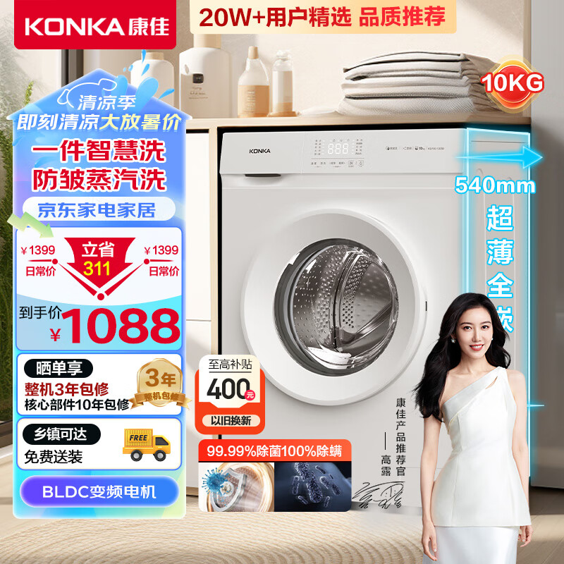 康佳10公斤滚筒洗衣机全自动 变频电机 大容量超薄全嵌 触控操作 除菌除螨 一级能效KG100-1205B价格:1088.00元!