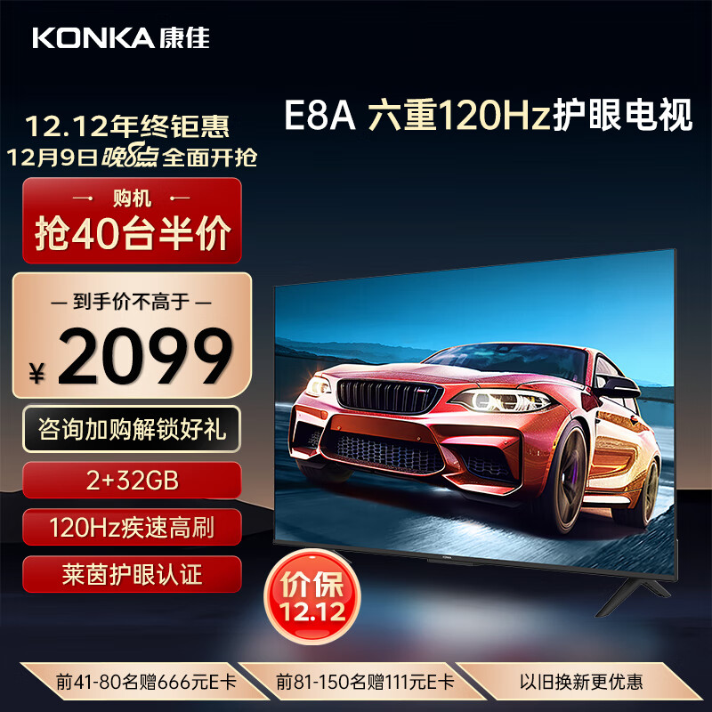 康佳电视 65E8A 65英寸 2+32GB 120Hz高刷护眼电视 4K超清屏 液晶平板电视机排行前十名以旧换新价格:1988.00元!