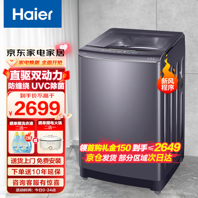 海尔(Haier)10KG新风双动力防缠绕波轮洗衣机全自动家用大容量直驱变频一级能效羽绒洗XQS100-BZ368T[家电]价格:2799.00元!