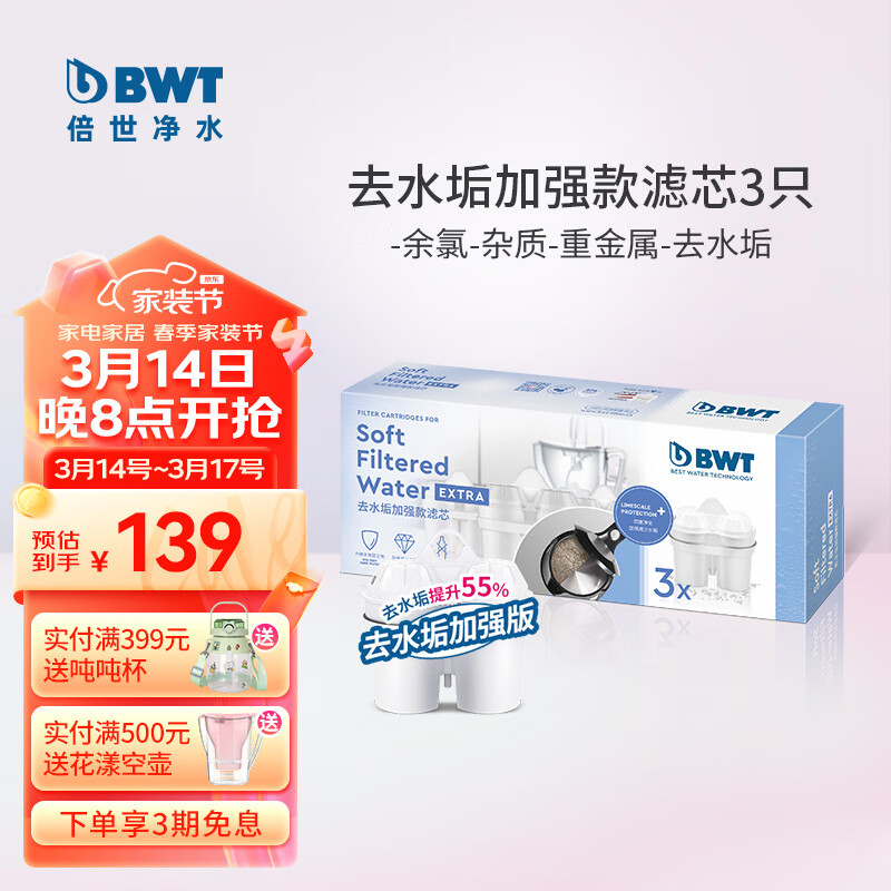 倍世(BWT) 欧洲原装进口第4代去水垢加强款滤芯 过滤净水壶滤水净水器滤芯去垢力提升55% 增强款3只装价格:139.00元!