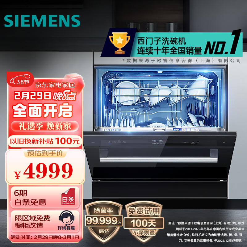 西门子原装进口 10套大容量 洗碗机嵌入式 加强烘干 除菌洗碗消毒一体 触控升级款 SC454B22AC价格:5599.00元!