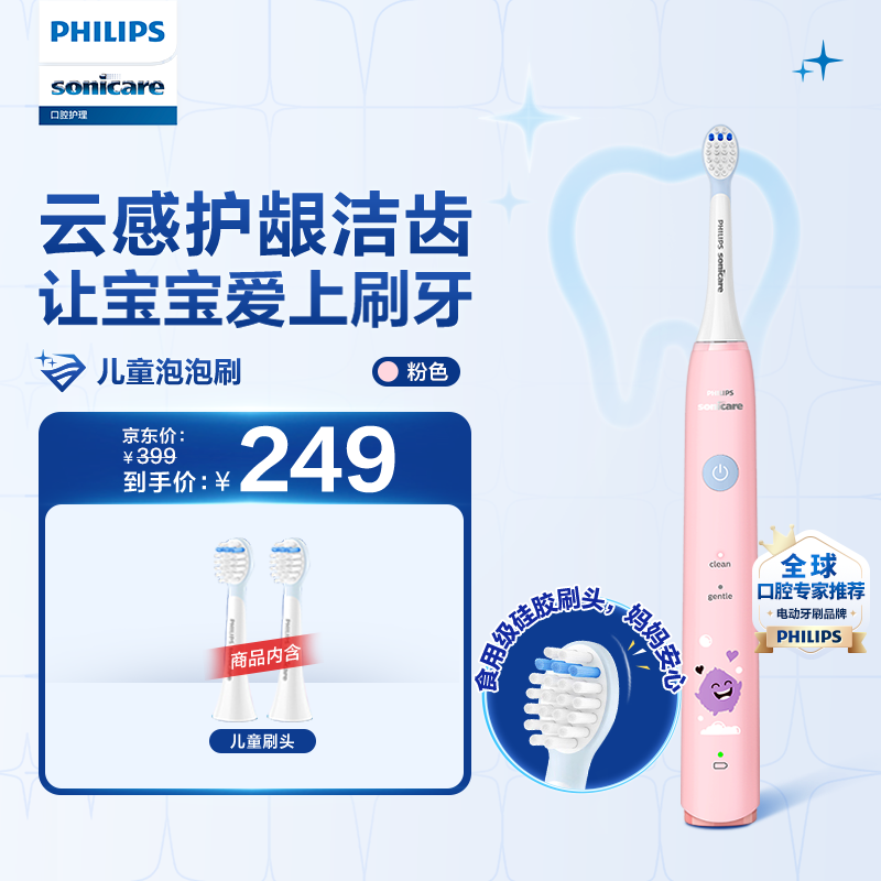 飞利浦(PHILIPS)儿童声波震动牙刷 男孩/女孩礼物 适用4-6-12岁 2种模式自带2支刷头温和清洁 粉HX2432/02价格:249.00元!