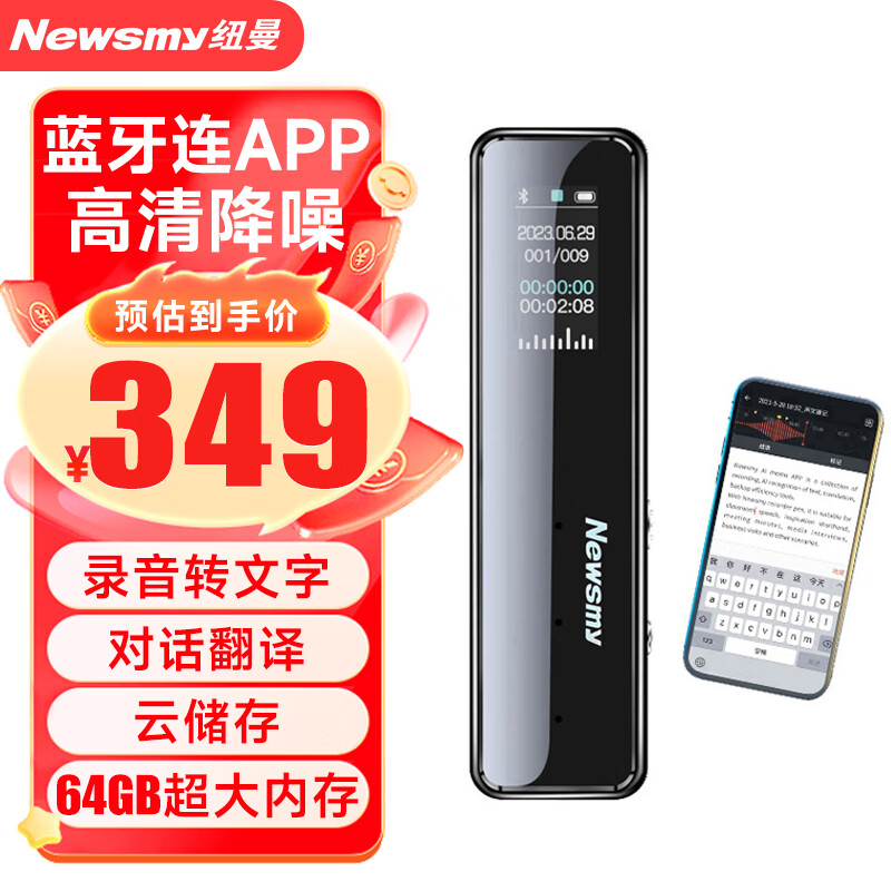 纽曼智能录音笔 XD01 声文速记 64G+云存储 专业高清降噪 会议录音转文字 实时成稿 同传翻译 黑色价格:399.00元!
