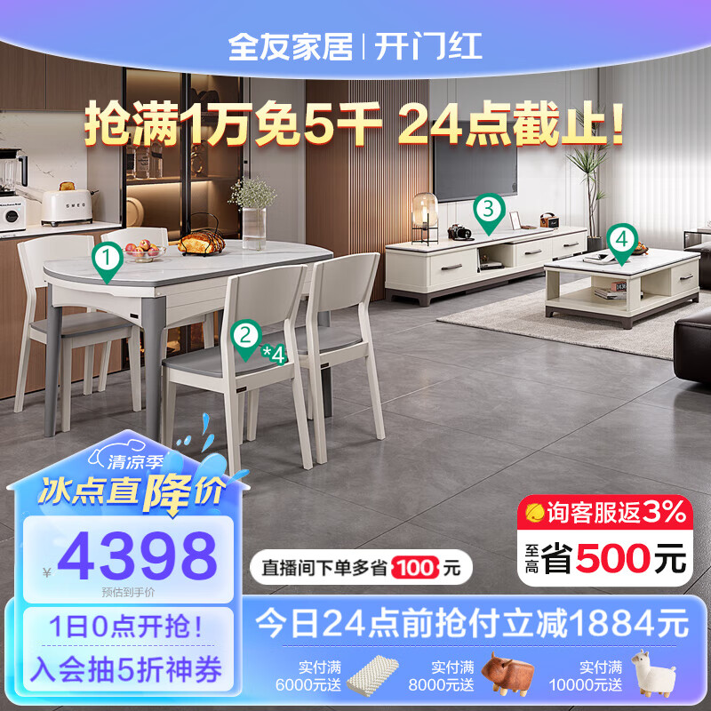 全友家居 现代岩板客餐厅7件套装120709茶几电视柜DW1028一桌四椅组合价格:6282.86元!