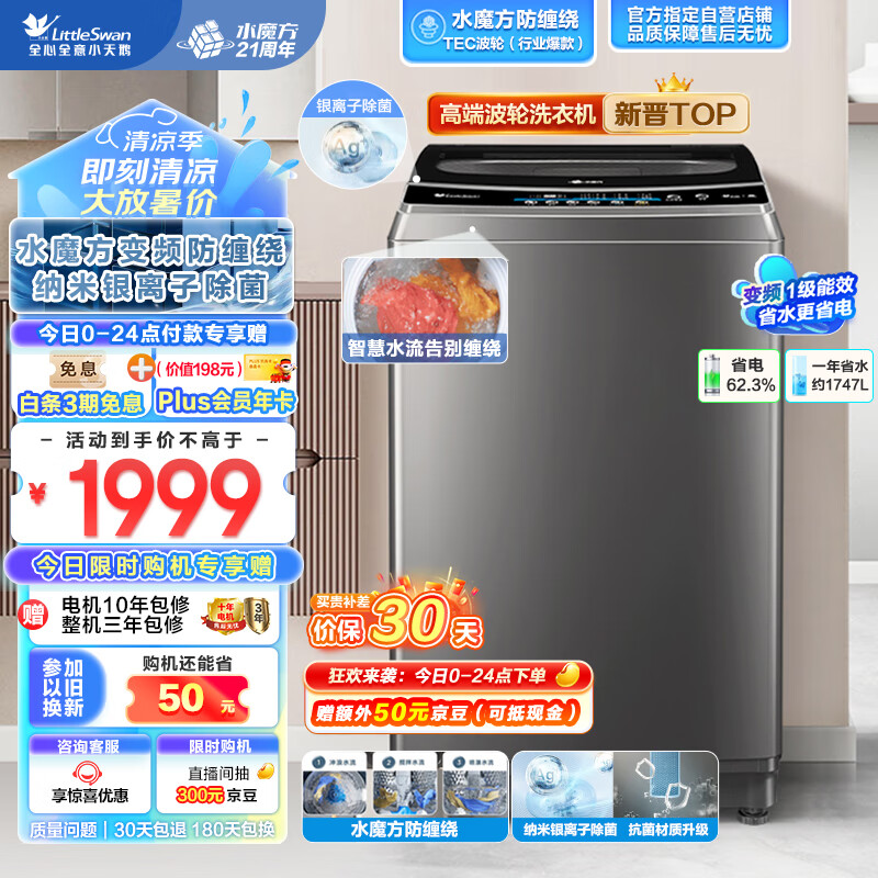 小天鹅(LittleSwan)波轮洗衣机全自动 水魔方系列 【TB100TEC】 变频防缠绕 健康除菌螨 直驱 以旧换新 10公斤价格:1999.00元!