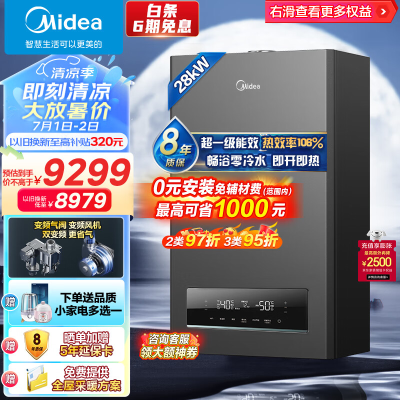 美的(Midea)双变频一级能效冷凝增压零冷水燃气壁挂炉 天然气采暖炉热水器 以旧换新 LL1PBD28-R53 PRO价格:10999.00元!
