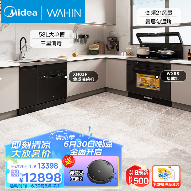 美的出品 集成灶 21风量油烟机 5.2KW火力 13套超一级水效集成洗碗机 WX9S+XH03P套装 天然气价格:13398.00元!