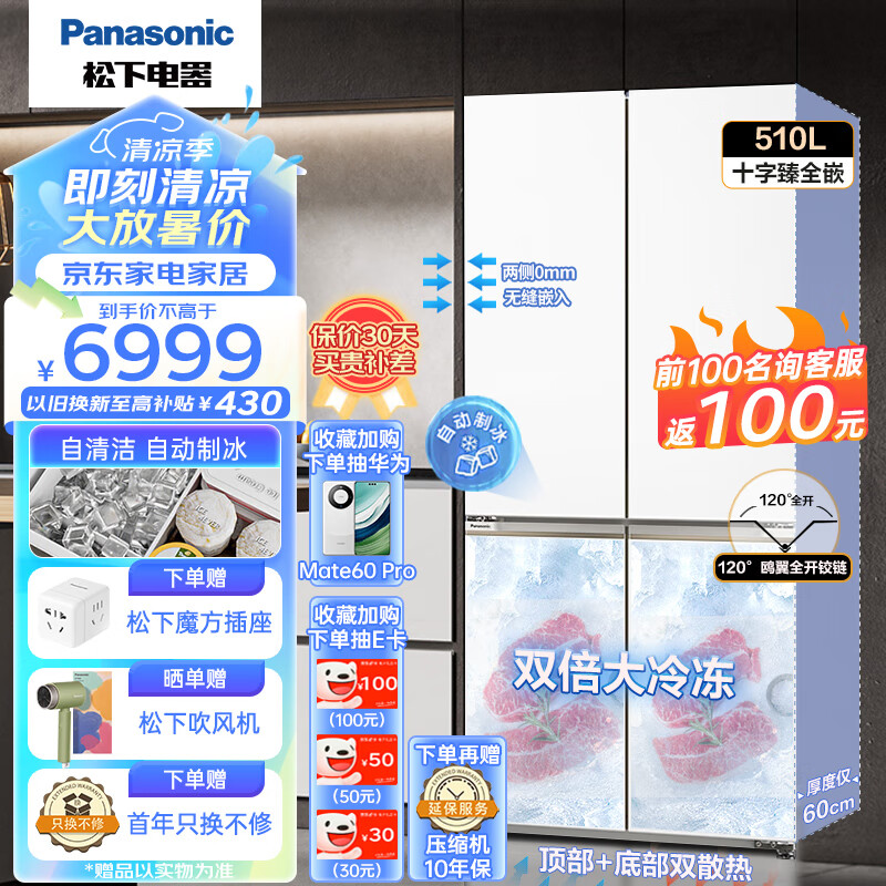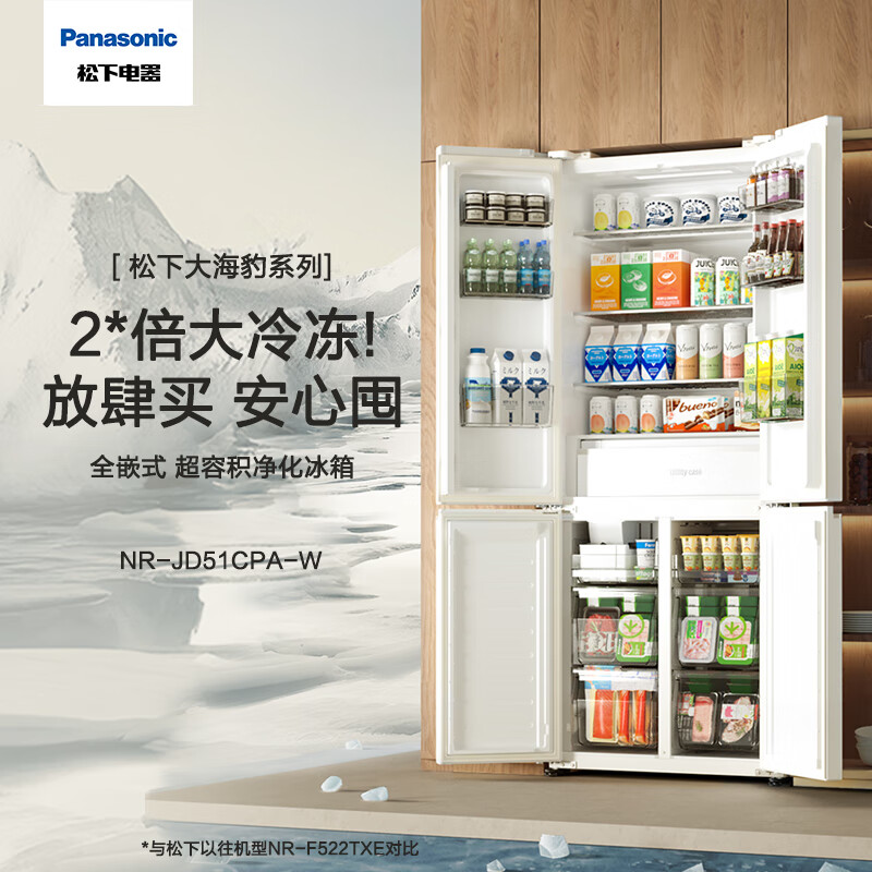 松下(Panasonic)24年款大海豹510升大容量超薄真全嵌入式大容量家用十字多门对开门零嵌高端电冰箱NR-JD51CPA-W价格:6999.00元!