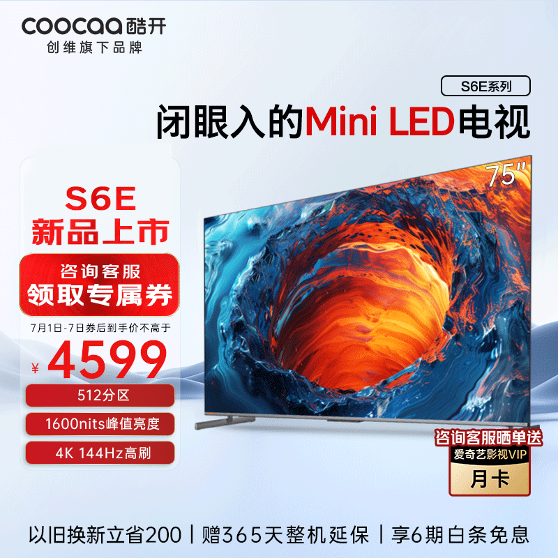 酷开 创维电视S6E 75英寸 Mini LED电视 512分区 1600nits 4K 144Hz高刷 护眼智能平板电视以旧换新 K6 75英寸价格:4599.00元!