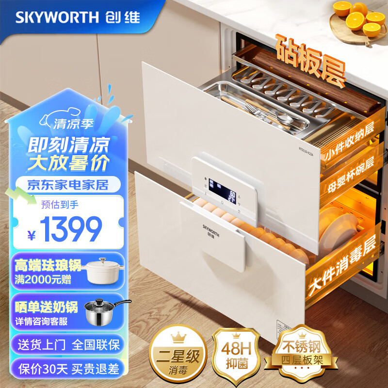 创维(Skyworth)消毒柜家用厨房嵌入式四层双抽消毒碗柜 大容量二高温消毒 白色消毒柜 X22A价格:1399.00元!