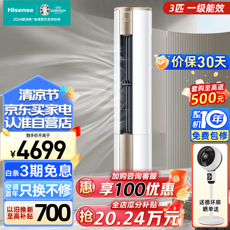 海信空调柜机3匹 新一级能效变频 柔风冷暖自清洁 智能WIFI低噪除湿 立式空调客厅 KFR-72LW/E500-A1价格:5799.00元!