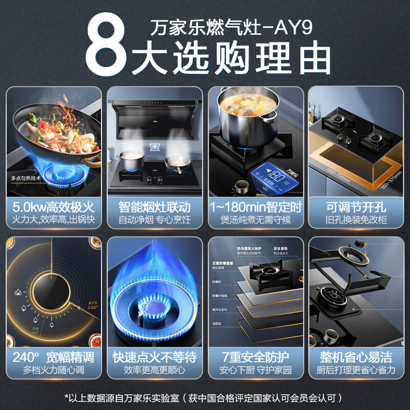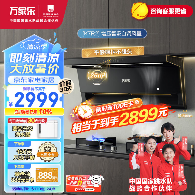 万家乐抽油烟机 25立方顶侧双吸超薄智能定时烟灶联动 换新免扩孔自调风量油烟机灶具套装K7R2+AY9液化气价格:3099.00元!