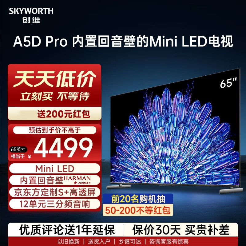 创维(Skyworth)电视65A5D Pro 65英寸 内置回音壁的Mini LED S+高透屏 144Hz高刷 4+64GB 4K高清语音屏电视价格:4299.00元!