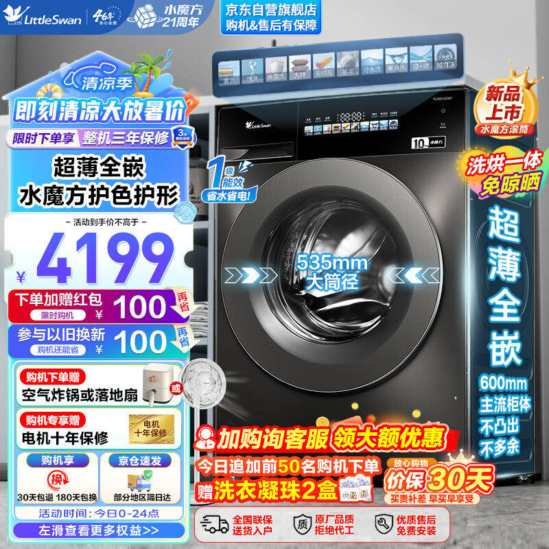 小天鹅(LittleSwan)滚筒洗衣机全自动水魔方洗烘一体洗衣机护色护形超薄全嵌10公斤大容量带烘干【TD100VC08T】价格:4198.00元!