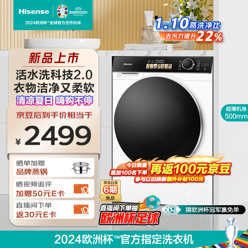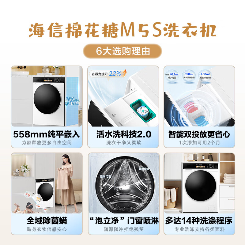 海信(Hisense)滚筒洗衣机全自动 10公斤超薄纯平全嵌入 智能双投放 1.1超高洗净比 活水洗2.0 WG100M5S价格:2599.00元!