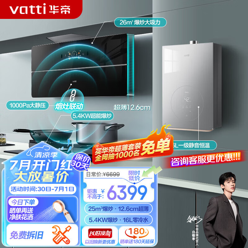 华帝(VATTI)12.6CM超薄X5/X5S/X7M/X7S抽油烟机灶具套装 25/26/27立方大吸力 自动洗燃气灶热水器三件套天然气 25m3风量丨烟灶联动丨X5S+95B+165价格:6399.00元!