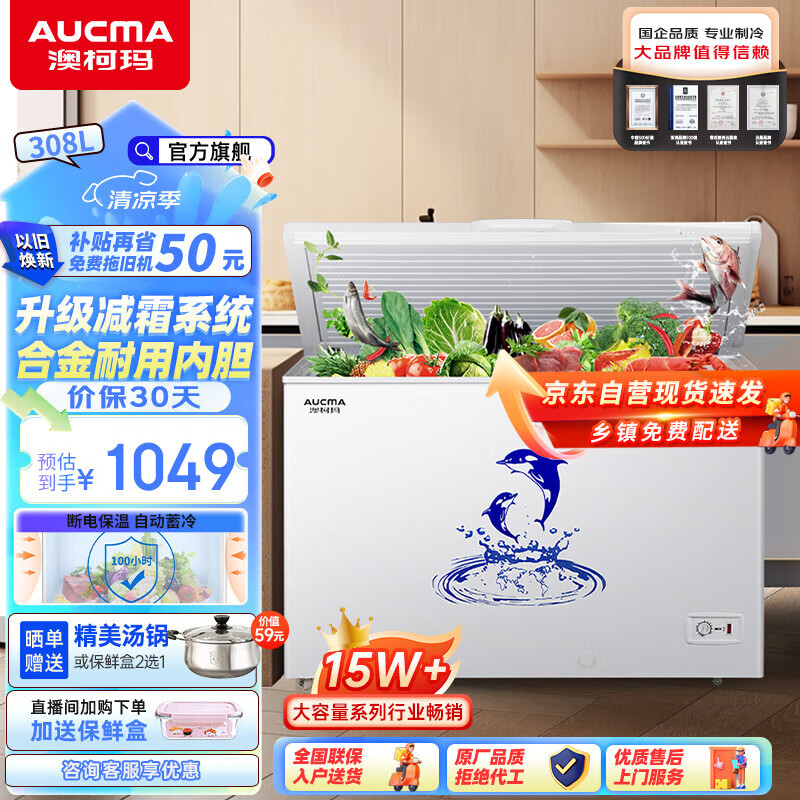澳柯玛(AUCMA)308升阻霜卧式商用家用冰柜 商用大容量 冷藏柜大冷冻柜冰柜家用冰箱大冷柜以旧换新 BC/BD-308HNE 308L价格:1099.00元!