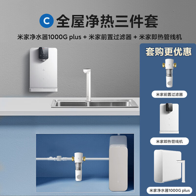 米家【净水+管线机+前置】净水器1000G Plus+管线机+前置过滤器 小米净水器套装C价格:2947.00元!
