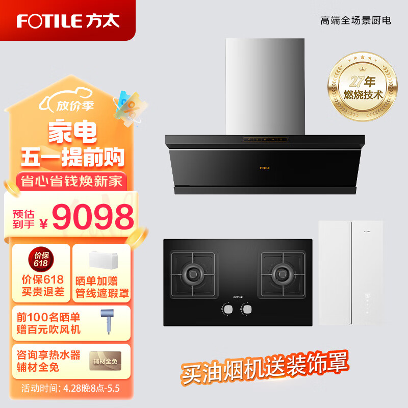 方太(FOTILE)家用厨房侧吸烟灶热三件套 22风量挥手智控烟机 5kW换装燃气灶 17升热水器JND1+TH36B+MS16T1价格:8098.00元!