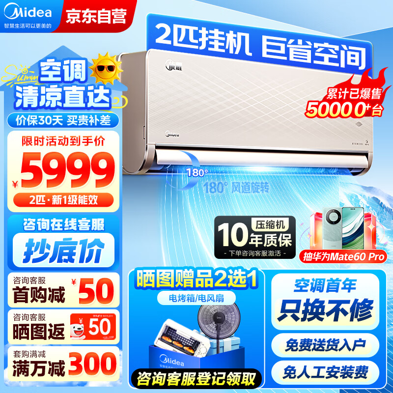 美的(Midea)空调2匹挂机 旋耀 新一级能效 变频冷暖 节能省电 壁挂式 大风量 KFR-50GW/N8MXA1 客厅商铺空调价格:6999.00元!