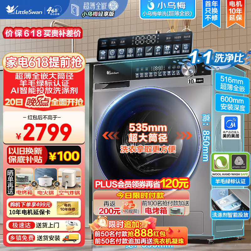 小天鹅(LittleSwan)洗衣机全自动 10公斤滚筒洗衣机水魔方小乌梅轻享版 超薄全嵌智能投放大筒径10公斤TG100SC18价格:3099.00元!