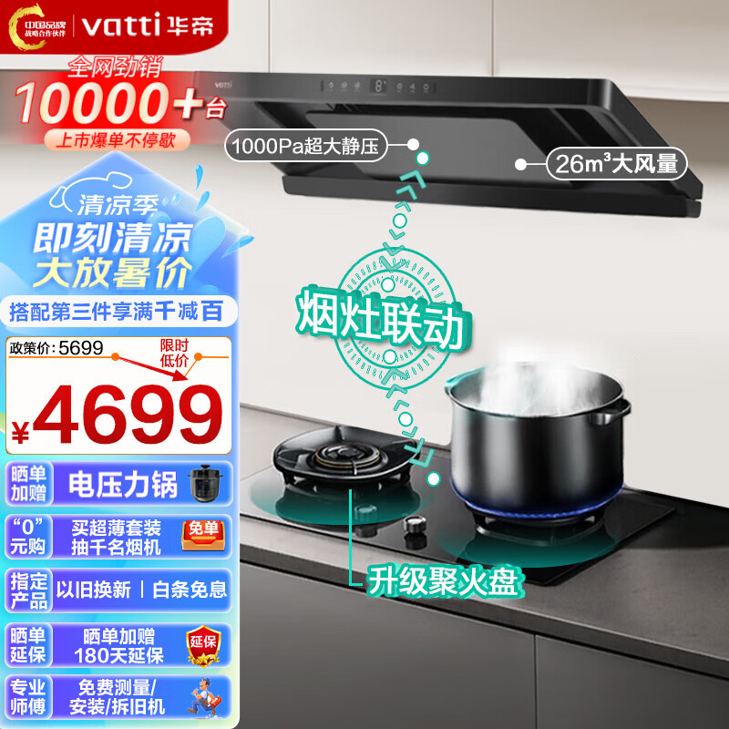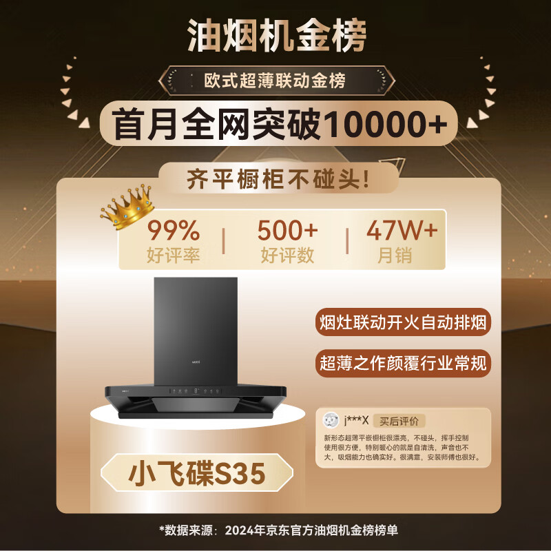华帝(VATTI)小飞碟S35前6油烟机灶具联动套装家用官方超薄三腔欧式变频26/27风量S35P/25立方S11 26m3联动小飞碟超薄S35+309L升级聚火盘价格:4699.00元!