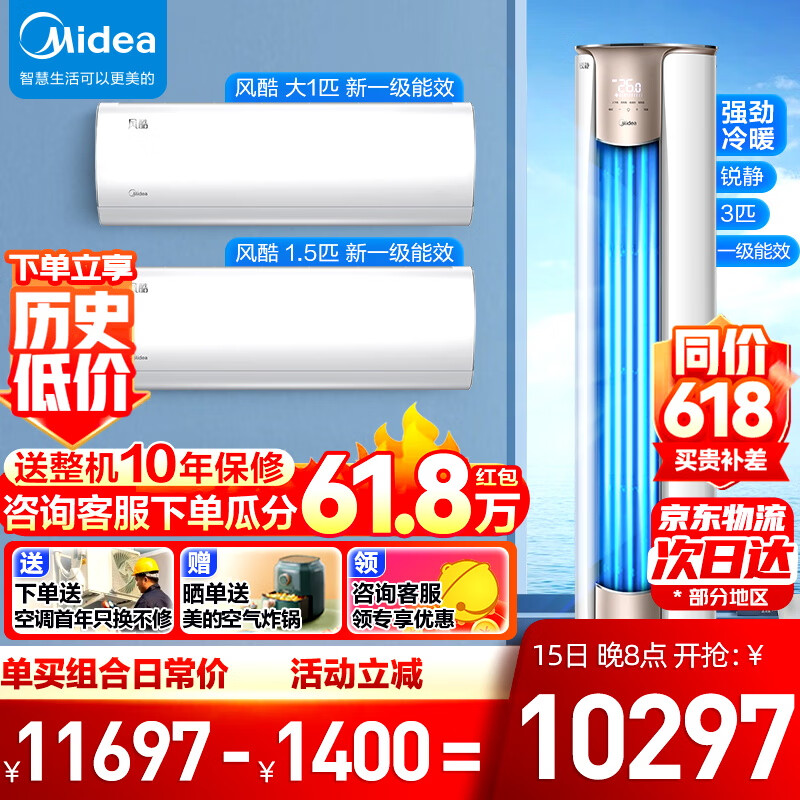 美的(Midea)新一级能效 空调套装 二室一厅套餐 锐静+风酷 省电节能变频冷暖空调 72VHC1+35XHC1+26XHC1价格:10397.00元!