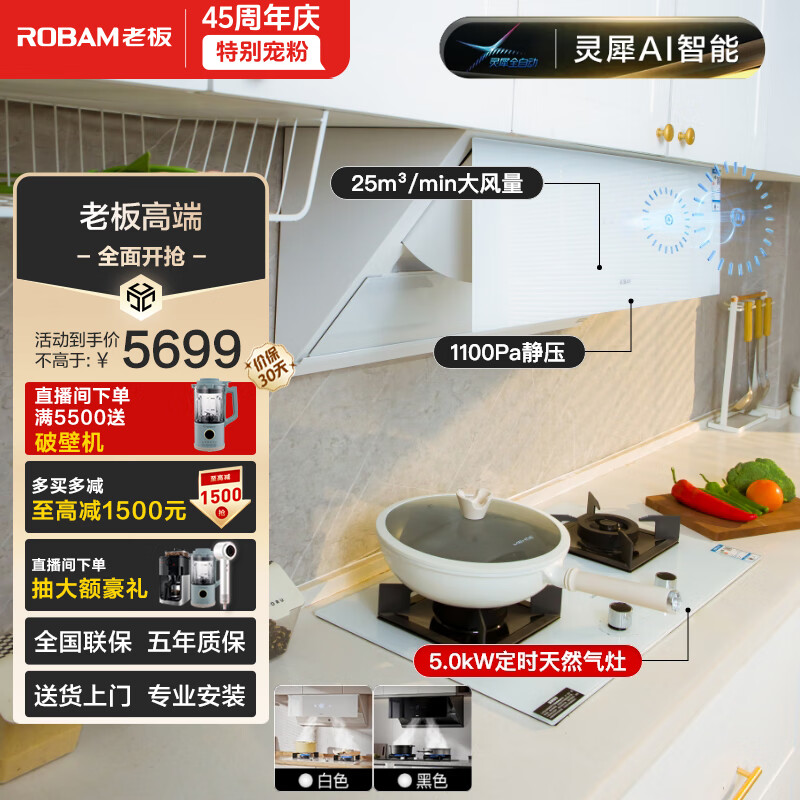 老板(Robam)【灵犀烟灶联动升级】抽油烟机变频家用25风量侧吸烟机燃气灶烟灶套装白色29X8SW+37B8XW(天然气)价格:5699.00元!