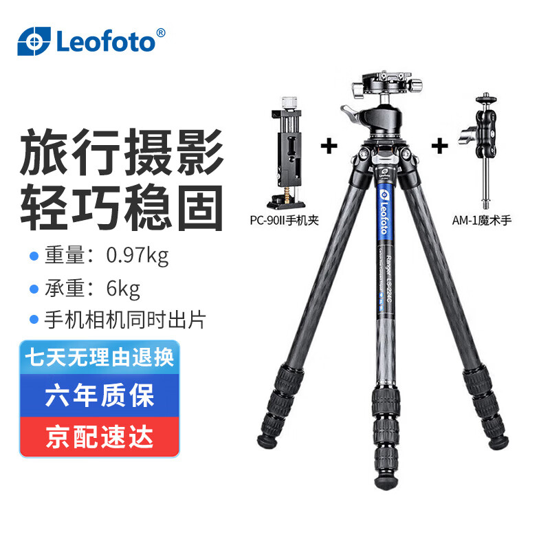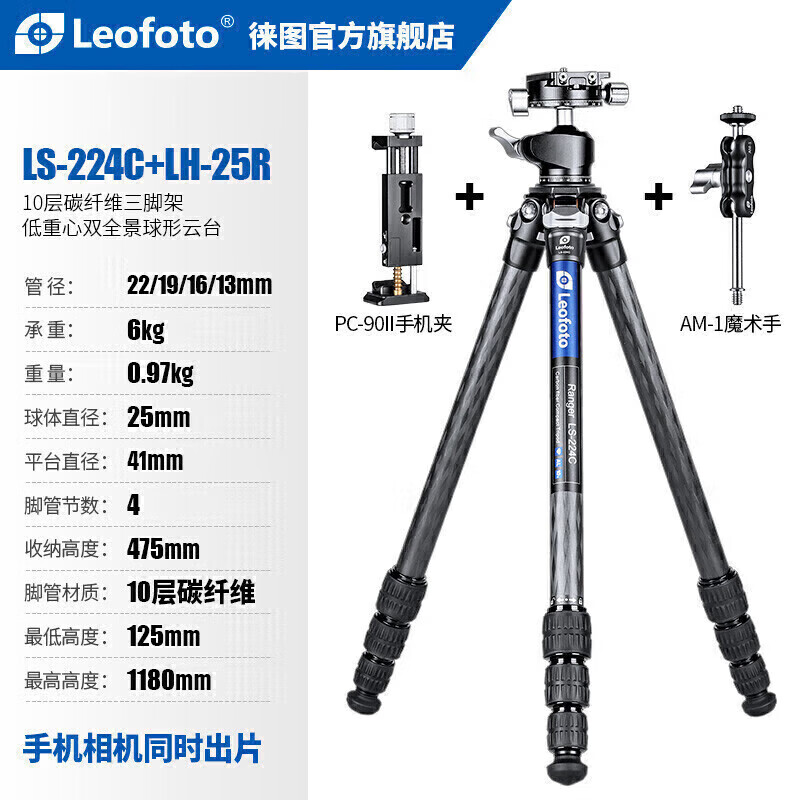 徕图(Leofoto)LS-224C+LH-25R+AM-1+PC-90II单反微单相机摄影便携无中轴碳纤维三脚架云台套装价格:1129.00元!