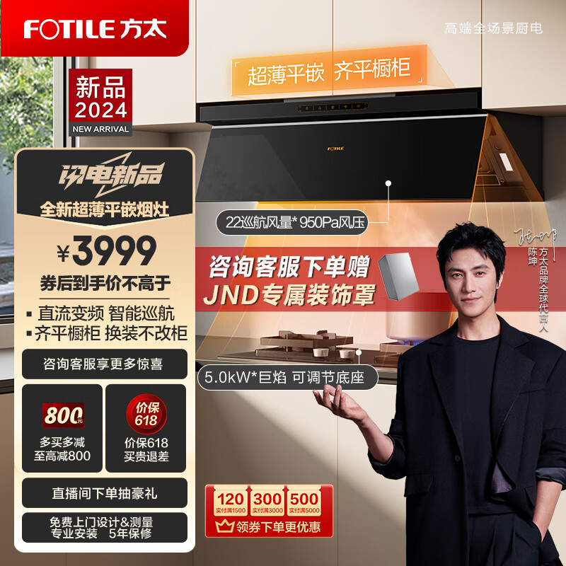 方太(FOTILE)【李佳琦直播间同款】抽油烟机超薄家用侧吸式烟灶套装挥手22大风量5.0kW猛火灶JND1+TH36B天然气价格:4299.00元!