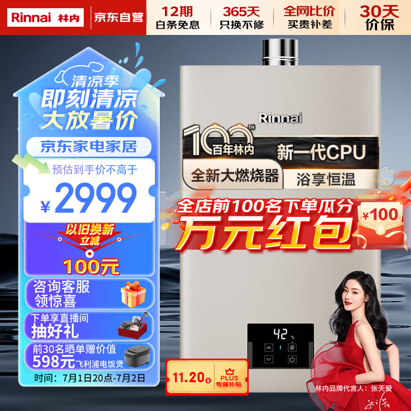 林内(Rinnai)【小蛮腰Pro】13升燃气热水器 全新智慧芯 恒温再升级 天然气热水器13GD32(JSQ26-GD32)以旧换新价格:2999.00元!