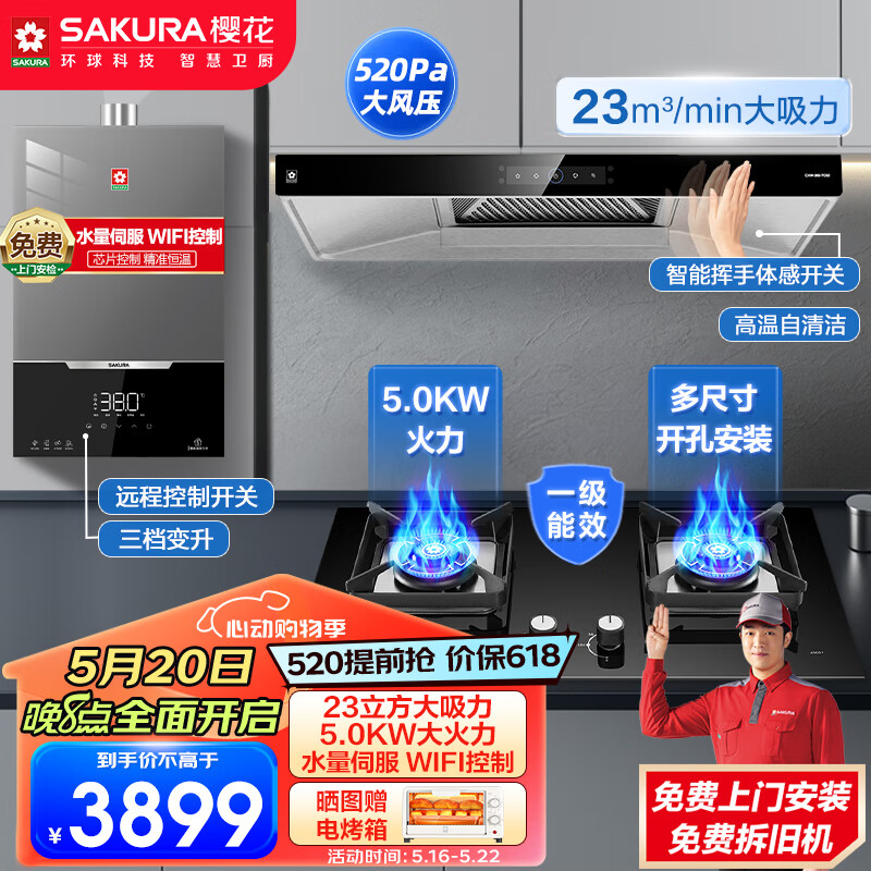 樱花(SAKURA)烟灶热套装23立方大吸力烟机搭5.0kW猛火大面板灶具水伺服13升燃热TC02+JGC01天然气+SG605价格:4199.00元!