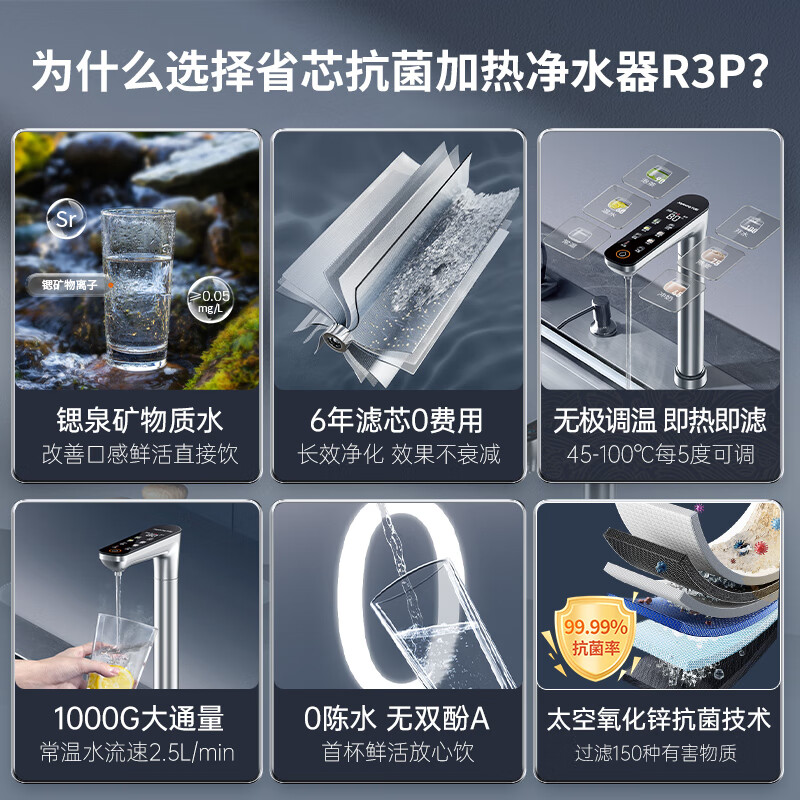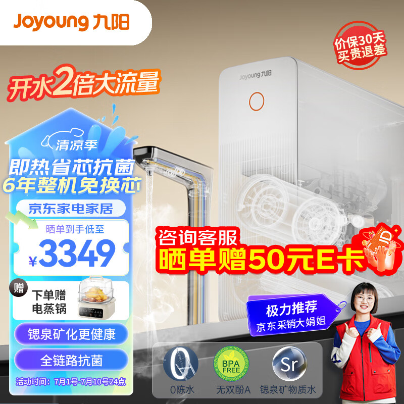 九阳(Joyoung)热小净 加热净水器 富锶 1000G大通量2.5L/min 即热出水 厨下家用反渗透直饮机 锶泉矿物质水R3P价格:3399.00元!