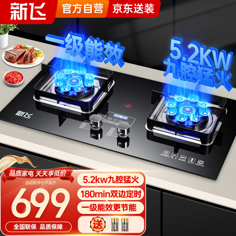 新飞家用燃气灶天然气双灶玻璃方形5.2KW一级能效嵌入式台式天然气猛火定时双九腔纯铜炉具JZT-A6价格:599.00元!