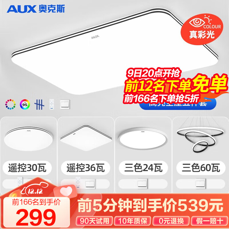 奥克斯(AUX)LED吸顶灯客厅大灯具套餐三室两厅餐厅卧室书房健康照明阳台灯 大客厅遥控90cm护眼3室2厅套餐D价格:749.00元!